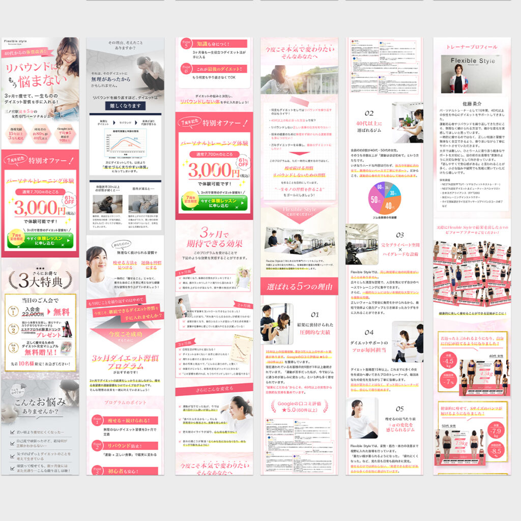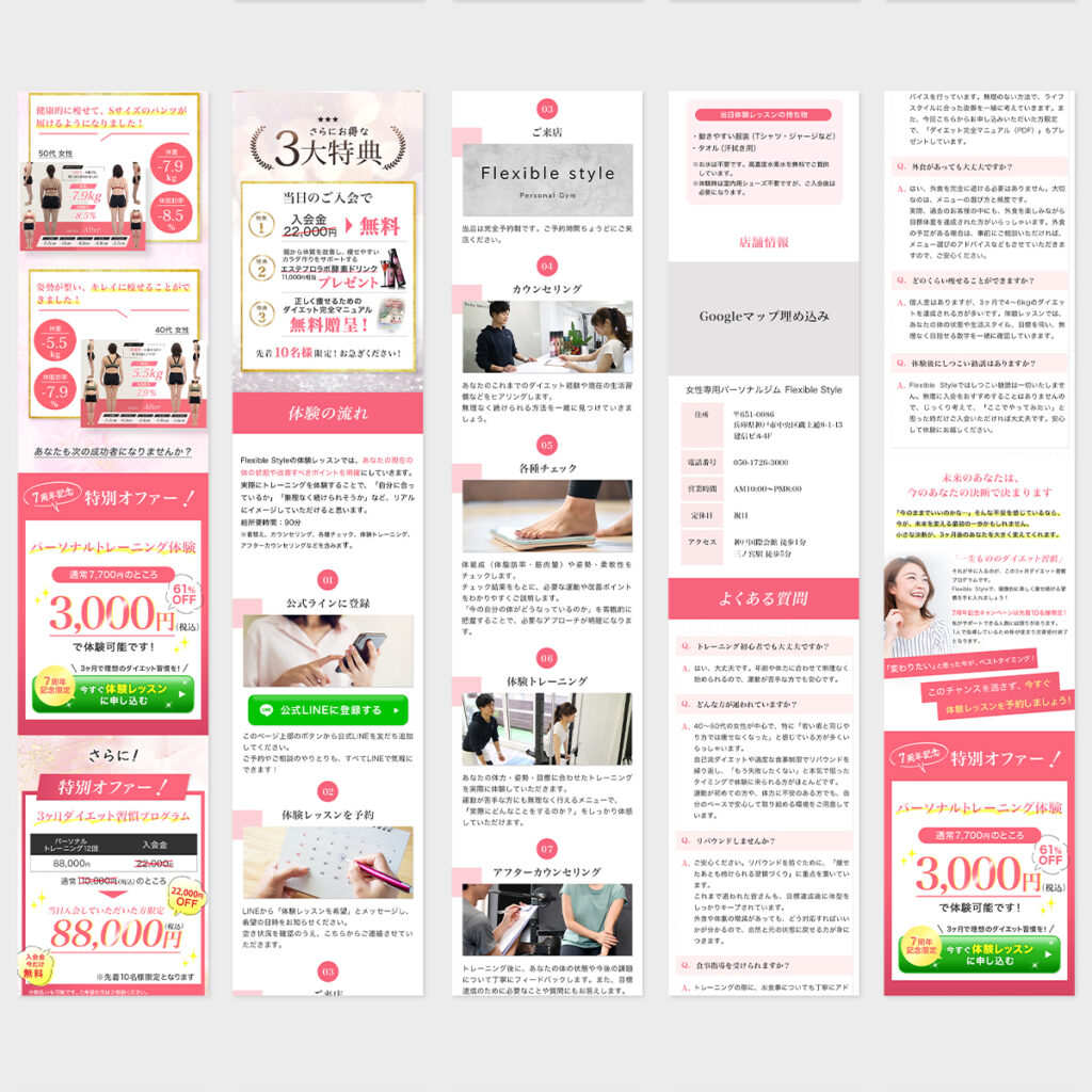 女性専門パーソナルジム「Flexible Style」様のダイエットコースへの体験レッスンへの集客および認知獲得に向けてのLPです。